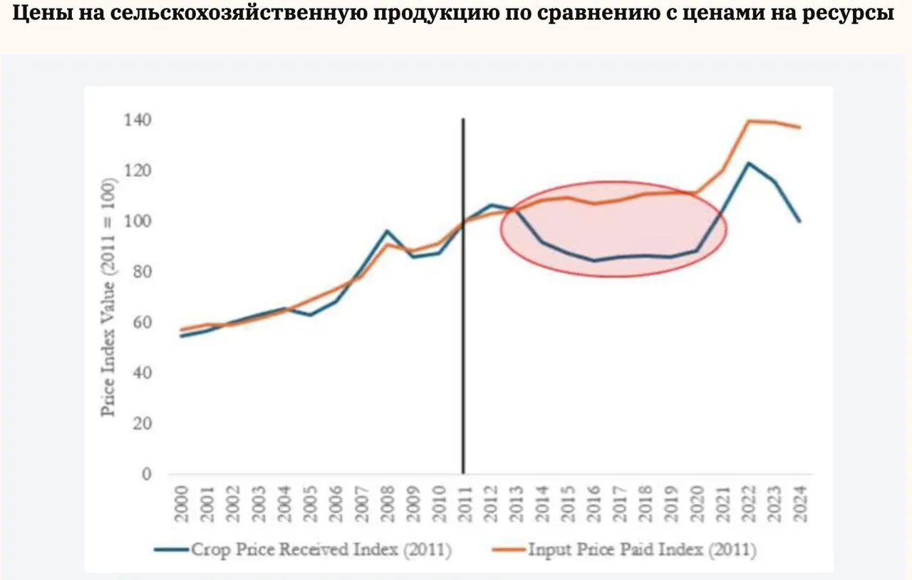 В период 2014-2020 гг. разница между динамикой цен на «инпуты» и «аутпуты» в мировом сельском хозяйстве начала заметно увеличиваться не в пользу фермерских доходов. Особенно проблема обострилась в 2023-2024 гг., когда урожаи основных сельскохозяйственных культур резко подешевели – более чем на 13%, а цены на производственные ресурсы почти не изменились (снизились менее чем на 2%). В 2025 году, несмотря на наметившееся легкое «укрепление цен» на сельхозпродукцию, проблема «ценовых ножниц» остается очень актуальной.