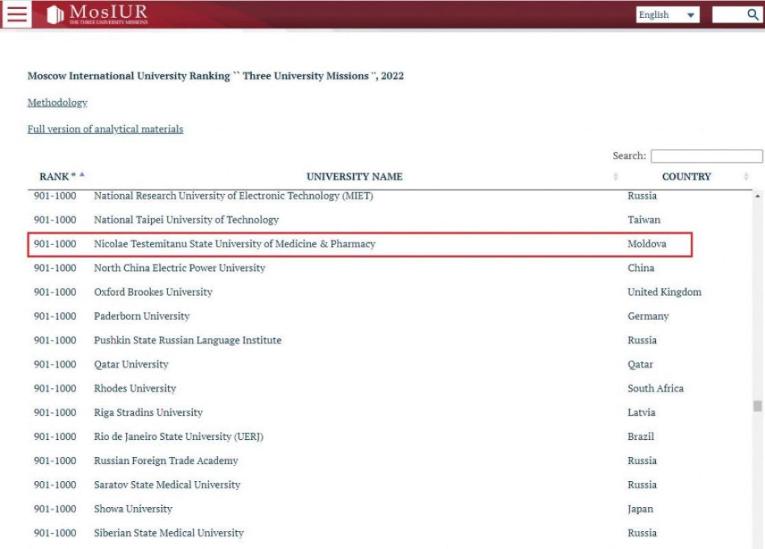 Государственный университет медицины и фармации им. Николае Тестемицану из Республики Молдова поднялся на 100 позиций в международном рейтинге «The Three University Missions (MosIUR)» 2022, 6-е издание.