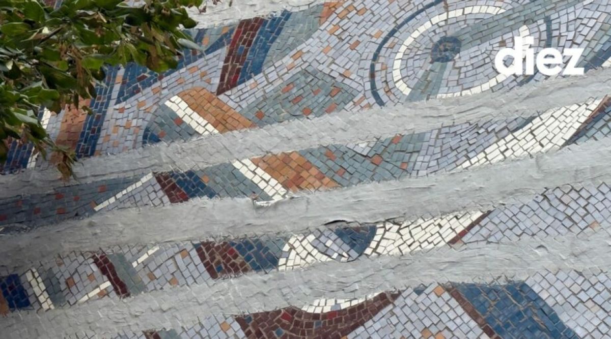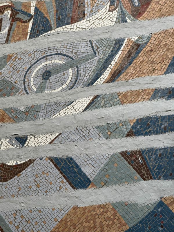 На здании филиала Национальной кассы социального страхования (ул. Буребиста, 108) есть мозаичное панно. Наверное, конструкция дала трещину, поэтому швы были зашпаклеваны. Это мешает лучше разглядеть работу.