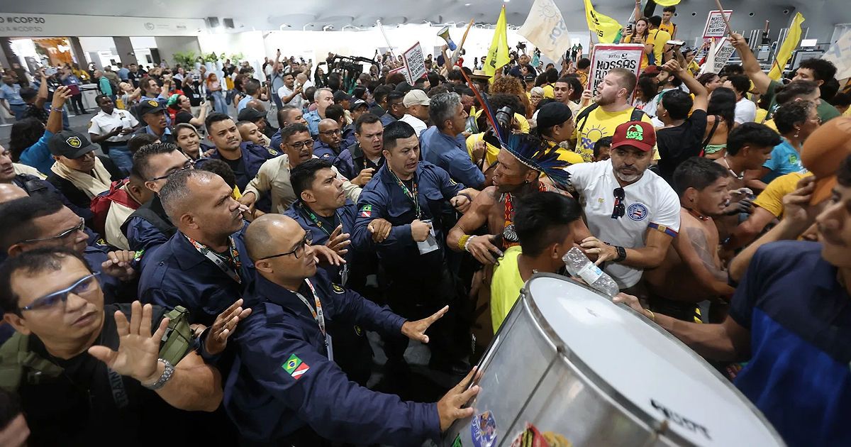 Двое охранников климатического саммита, который проходит в Бразилии, получили травмы после того, как представители коренных народов, населяющих дельту реки Амазонки, попытались прорваться на заседание.