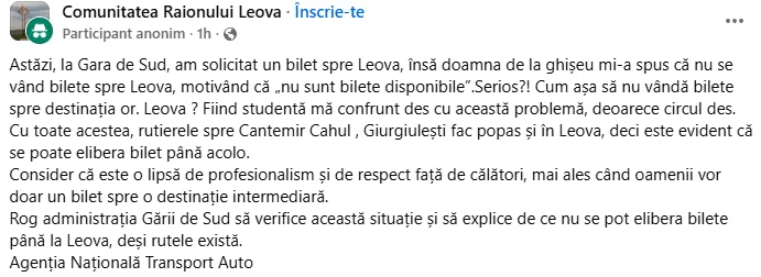 По её словам, вчера утром она попросила билет до города Леова, но кассирша сообщила ей, что билетов на этот маршрут нет. Ее пост вызвал множество откликов в интернете, и многие пользователи сети отметили, что сталкивались с подобными ситуациями, передает noi.md со ссылкой на unimedia.info