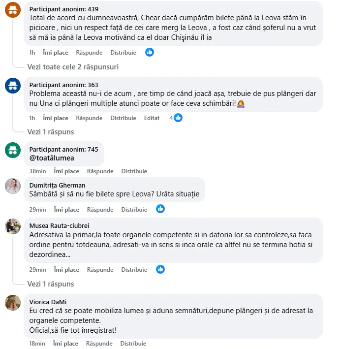 «Полностью с вами согласна. Даже если мы покупаем билеты до Леова, мы стоим на ногах. Никакого уважения к тем, кто едет в Леова. Был случай, когда водитель не захотел везти меня в Леова мотивируя это тем, что он берет только Кишинёв», — отозвался другой пользователь.